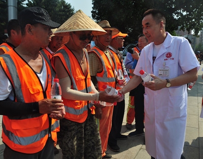 “感谢你们的关心,免费给我们清洁工送来了瓶装水!”,沈阳环卫工人王瑞接过沈阳肤康医院医护人员送上的瓶装水后激动地说。8月份以来,沈阳出现持续30℃以上的高温天气,考虑到高温酷暑仍坚守在一线工作的环卫工人们,辽宁好人徐海波党员志愿服务联盟联合沈阳肤康医院志愿分队开展了 “为环卫工人酷暑送清凉”活动,为高温酷暑仍坚守在一线工作的清洁工们送上关爱。同时,还叮嘱一线的清洁工人们在高温天气里要搞好防暑降温,注意身体健康,工作时要注意安全。
