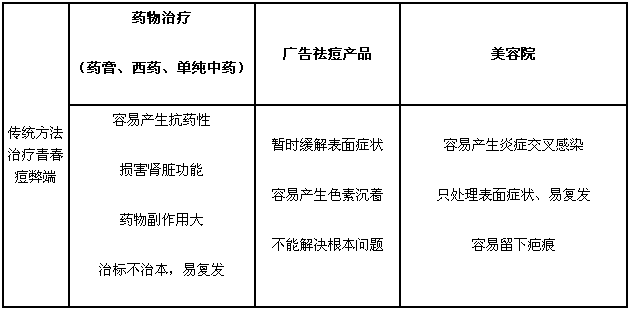 传统方法治疗青春痘,存在很多弊端,具体见下表: