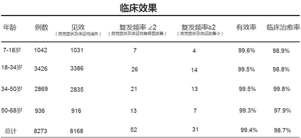 在中华医学会第十八次全国皮肤性病学术年会上,通过对多种湿疹疗法的临床数据分析对比,结果显示“中西医脱敏渗透免疫疗法”治疗湿疹的有效率达到99.4%,临床治愈率高达98.7%,大大高出其它疗法。